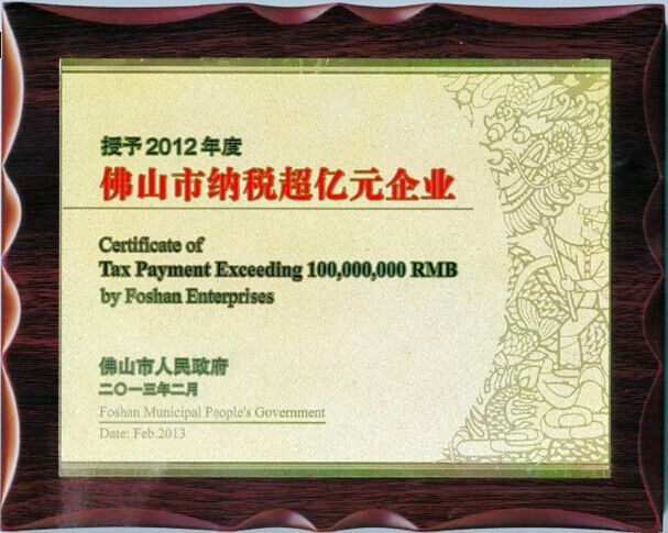 2013年3月25日,在南海區政府召開(kāi)南商再出發(fā)——南海區進(jìn)一步促進(jìn)民營(yíng)經(jīng)濟發(fā)展大會(huì )上,我司榮登佛山市南海區2012年度納稅大戶(hù)光榮榜,被予以通報表彰。2012年我公司稅收由上年的7000多萬(wàn)元上升到約1.2億元,成為佛山市南海區為數不多納稅超億元企業(yè)。