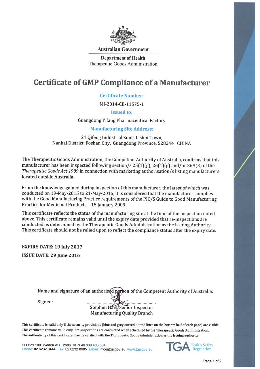 06月29日,一方制藥旗峰廠(chǎng)區順利通過(guò)澳大利亞TGA(TherapeuticGoods Administration)的復認證,這是自1999年率先通過(guò)澳大利亞GMP認證證書(shū)(GMPCertificateof Manufacturing Facility)以來(lái),一方制藥第八次順利取得該項證書(shū)。