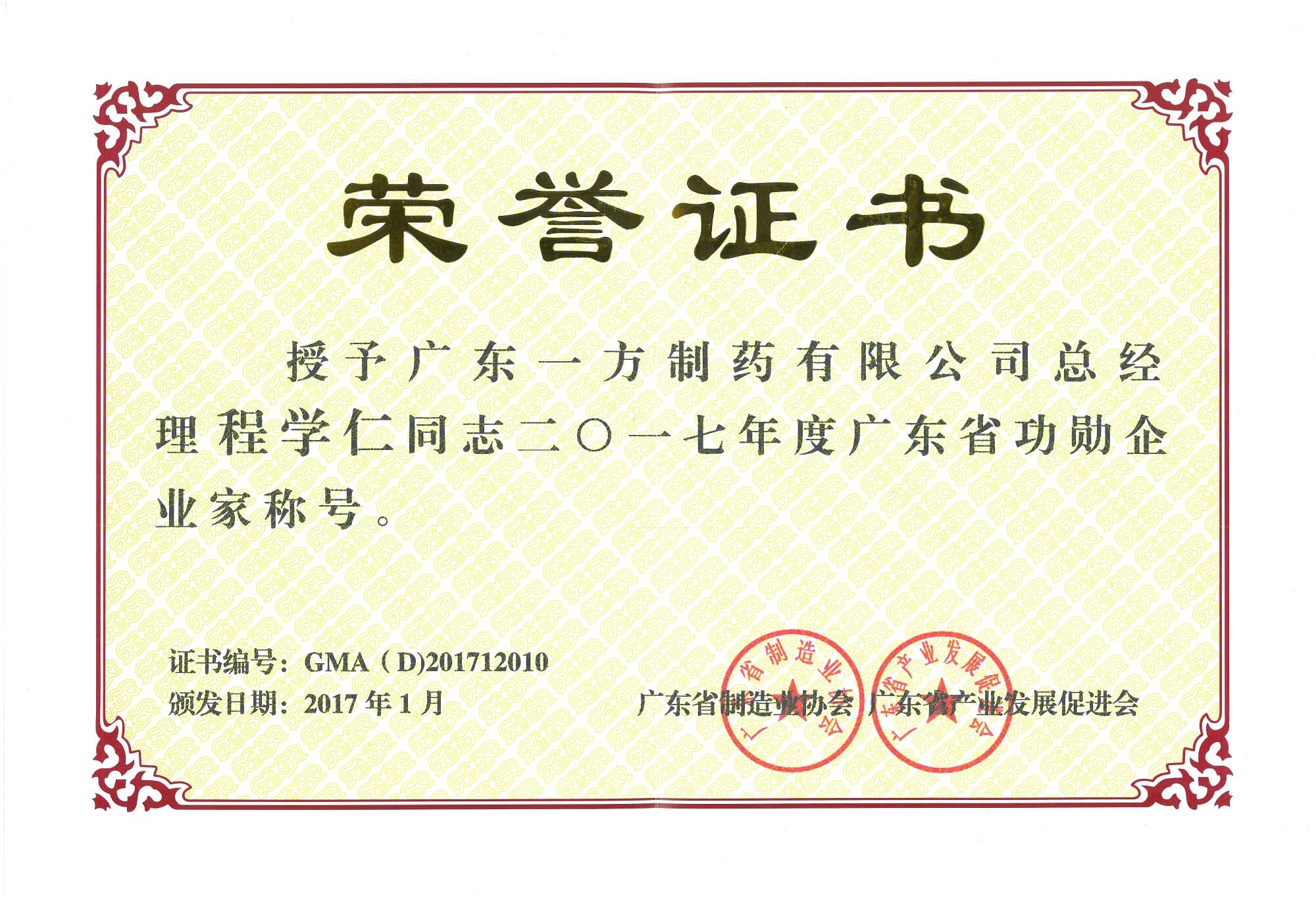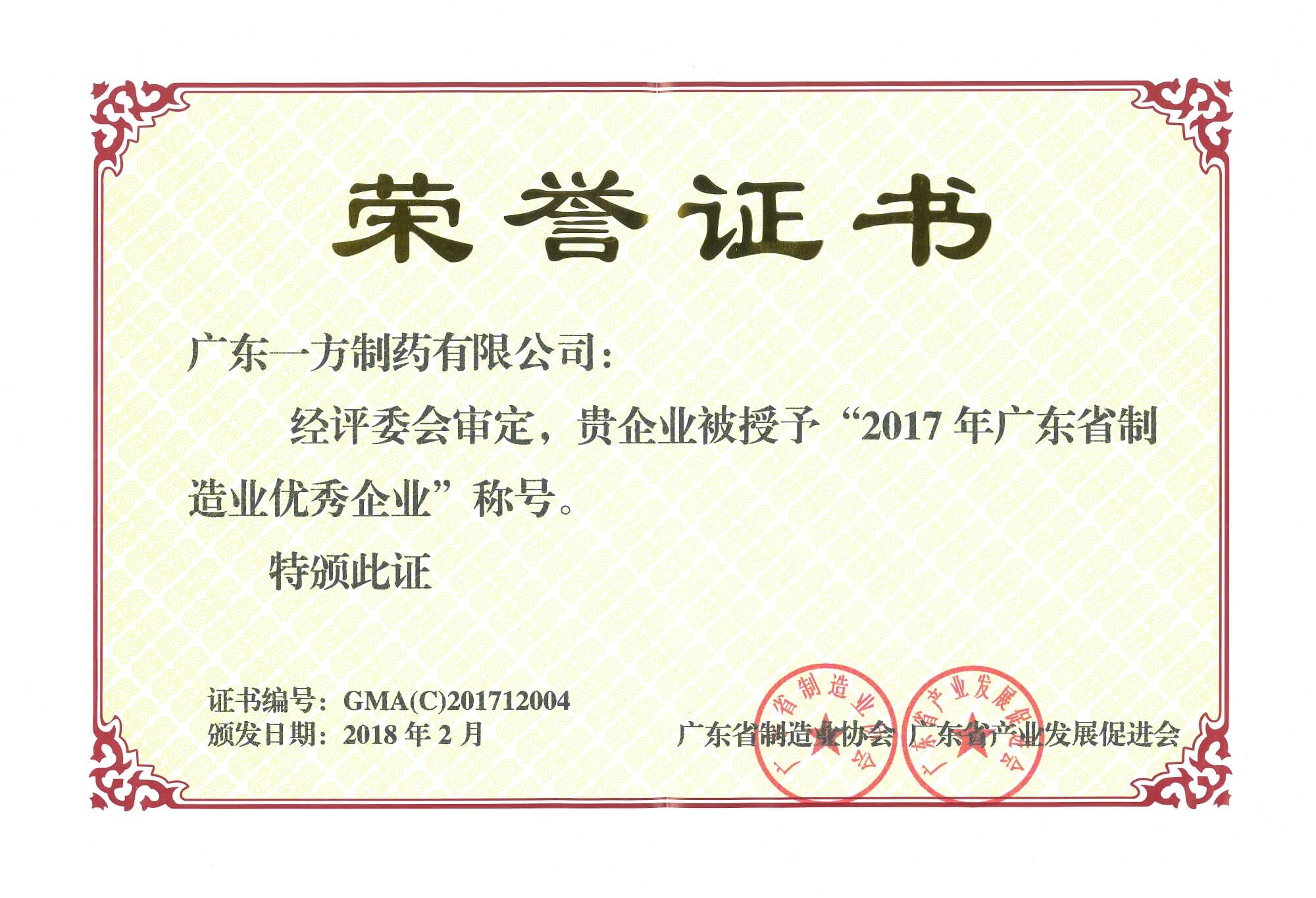 廣東一方制藥有限公司憑借2017年度積極穩健的發(fā)展,以及在中醫藥傳統行業(yè)的智能制造創(chuàng )新,榮獲2017年度廣東省制造業(yè)優(yōu)秀企業(yè)、廣東省優(yōu)秀品牌示范企業(yè)兩項桂冠,公司總經(jīng)理程學(xué)仁先生榮獲2017年廣東省制造業(yè)功勛企業(yè)家稱(chēng)號。