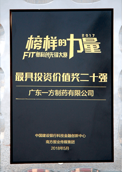 近日,由中國建設銀行科技金融創(chuàng )新中心、南方報業(yè)傳媒集團聯(lián)合主辦的“榜樣的力量——2017‘FIT粵’科創(chuàng )先鋒大賽”圓滿(mǎn)結束,一方制藥榮獲“最具投資價(jià)值二十強”獎項,副省長(cháng)黃寧生出席活動(dòng)并為獲獎企業(yè)頒獎。