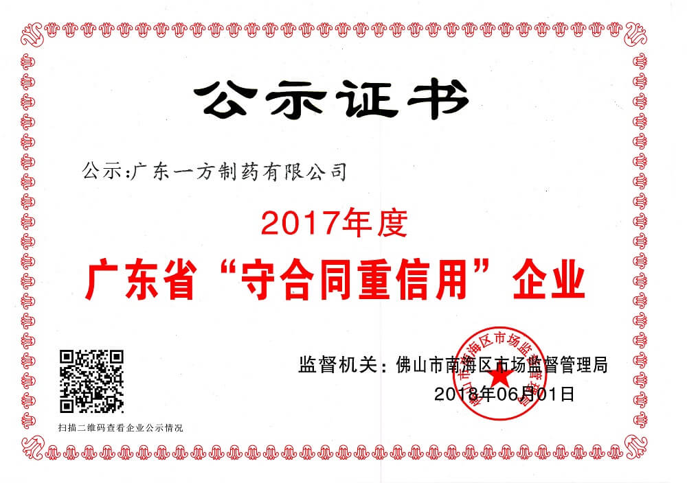 近日,廣東一方制藥有限公司獲得了佛山市市場(chǎng)監督管理局頒發(fā)的2017年度廣東省“守合同重信用”企業(yè)證書(shū)。