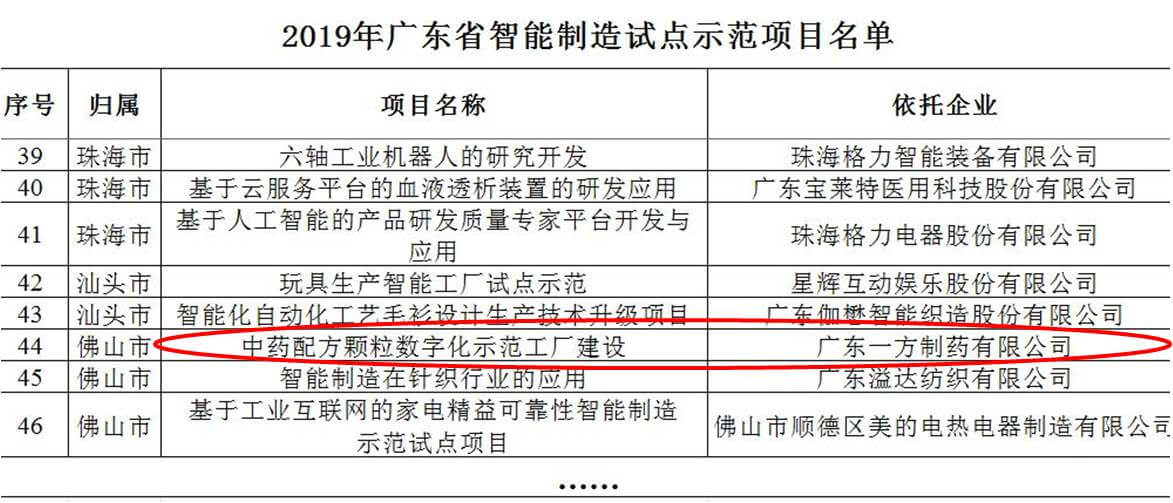 廣東省工業(yè)和信息化廳7月29日發(fā)布粵工信裝備函〔2019〕1551號《關(guān)于公布2019年省智能制造試點(diǎn)示范項目的通知》,公布了57個(gè)2019年省智能制造試點(diǎn)示范項目,其中廣東一方制藥有限公司憑“中藥配方顆粒數字化示范工廠(chǎng)建設”位列其中。