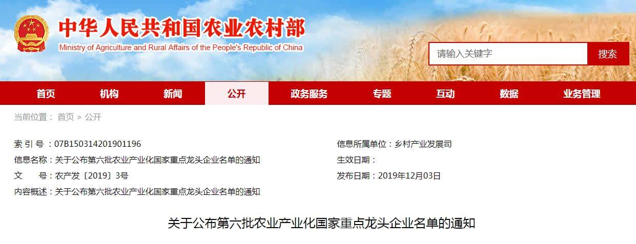 12月3日,國家農業(yè)農村部發(fā)布農產(chǎn)發(fā)〔2019〕3號文件,《關(guān)于公布第六批農業(yè)產(chǎn)業(yè)化國家重點(diǎn)龍頭企業(yè)名單的通知》: