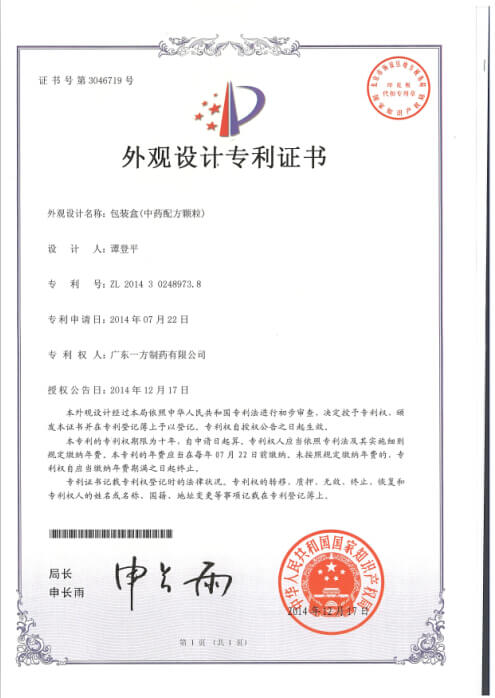 DYNAMIC INFORMATION近期,國家知識產(chǎn)權局發(fā)文公告授權我公司4項專(zhuān)利,其分別為兩項發(fā)明專(zhuān)利“一種檢測決明子配方顆粒中大黃酚含量的方法”和“一種改善中藥配方顆粒噴霧干燥工藝的輔料組合及其應用”,實(shí)用新型專(zhuān)利“一種可快速排液的動(dòng)態(tài)提取罐”,外觀(guān)專(zhuān)利“包裝盒(中藥配方顆粒)”。2014年至今,我公司圍繞中藥配方顆粒產(chǎn)業(yè)化研究及相關(guān)產(chǎn)業(yè)研究,累計獲得發(fā)明專(zhuān)利授權3項,實(shí)用新型1項,外觀(guān)專(zhuān)利1項。相關(guān)成果的應用與保護,將為一方制藥進(jìn)一步推進(jìn)中藥配方顆粒全面產(chǎn)業(yè)化,促進(jìn)企業(yè)跨越發(fā)展,成就國內中藥配方顆粒領(lǐng)導者奠定堅實(shí)的基礎。